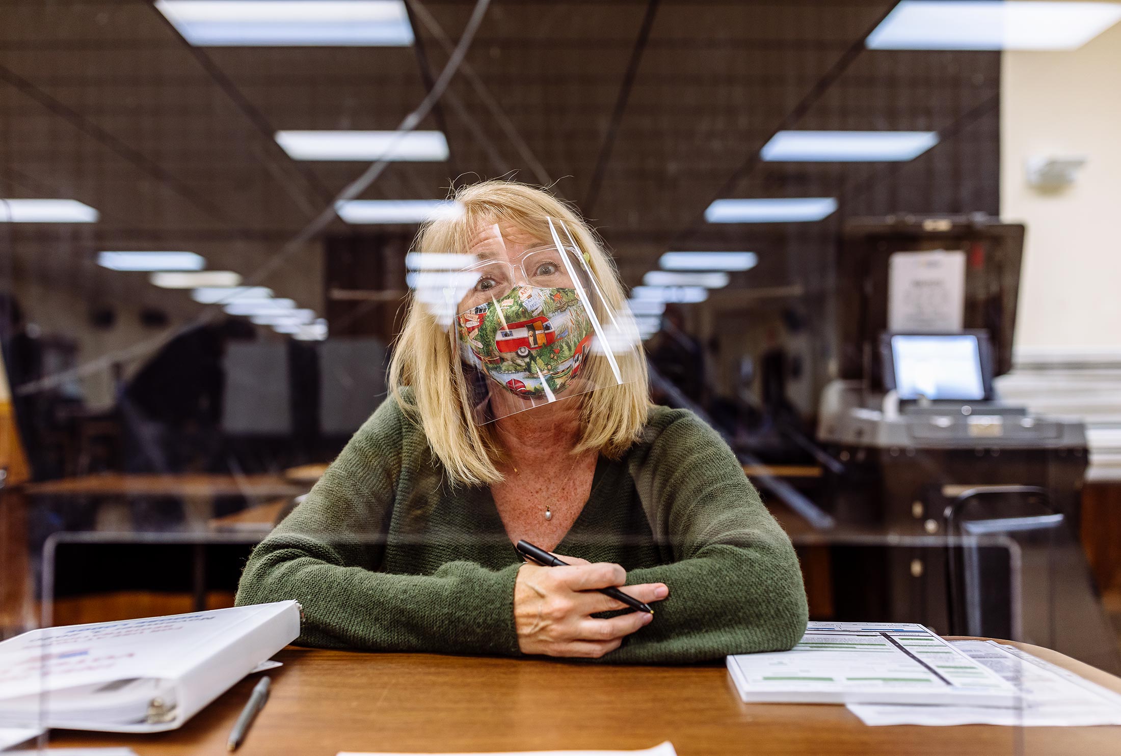 在威斯康星州基诺沙的一家驼鹿会所,安·明吉利诺在一张选民登记桌旁工作。