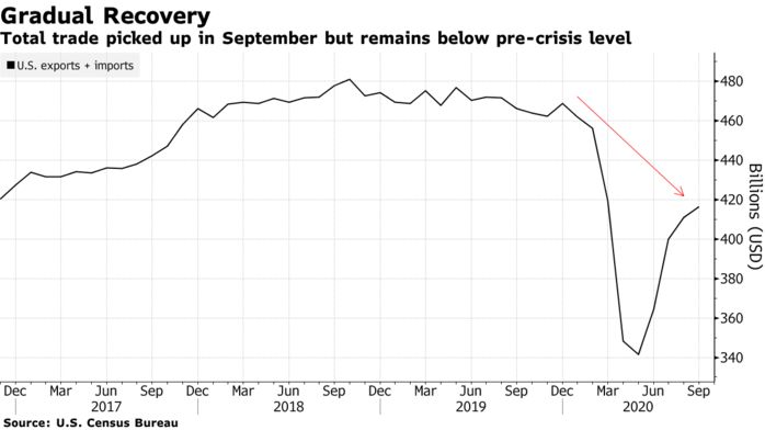 美国贸易逆差在9月份首次收窄,因出口增长而进口增长放缓,尽管整体交易仍远低于疫情前水平。