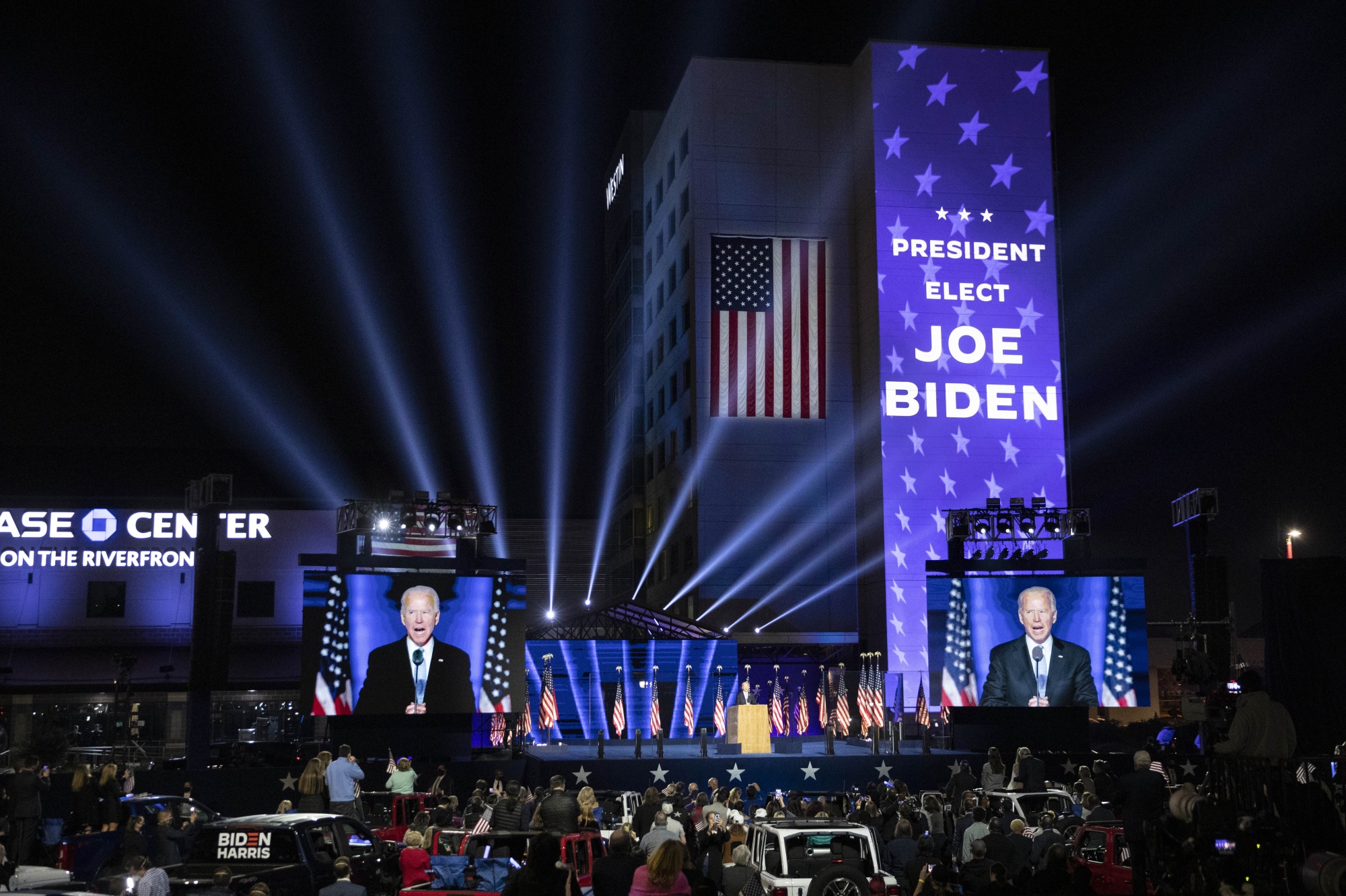 “为了取得进展,我们必须停止将我们的对手视为敌人。我们不是敌人。我们是美国人,”拜登在特拉华州威明顿的一次汽车集会上告诉欢呼和鸣笛的人群,在他赢得总统大选几小时后,引发了全美各地的庆祝活动。