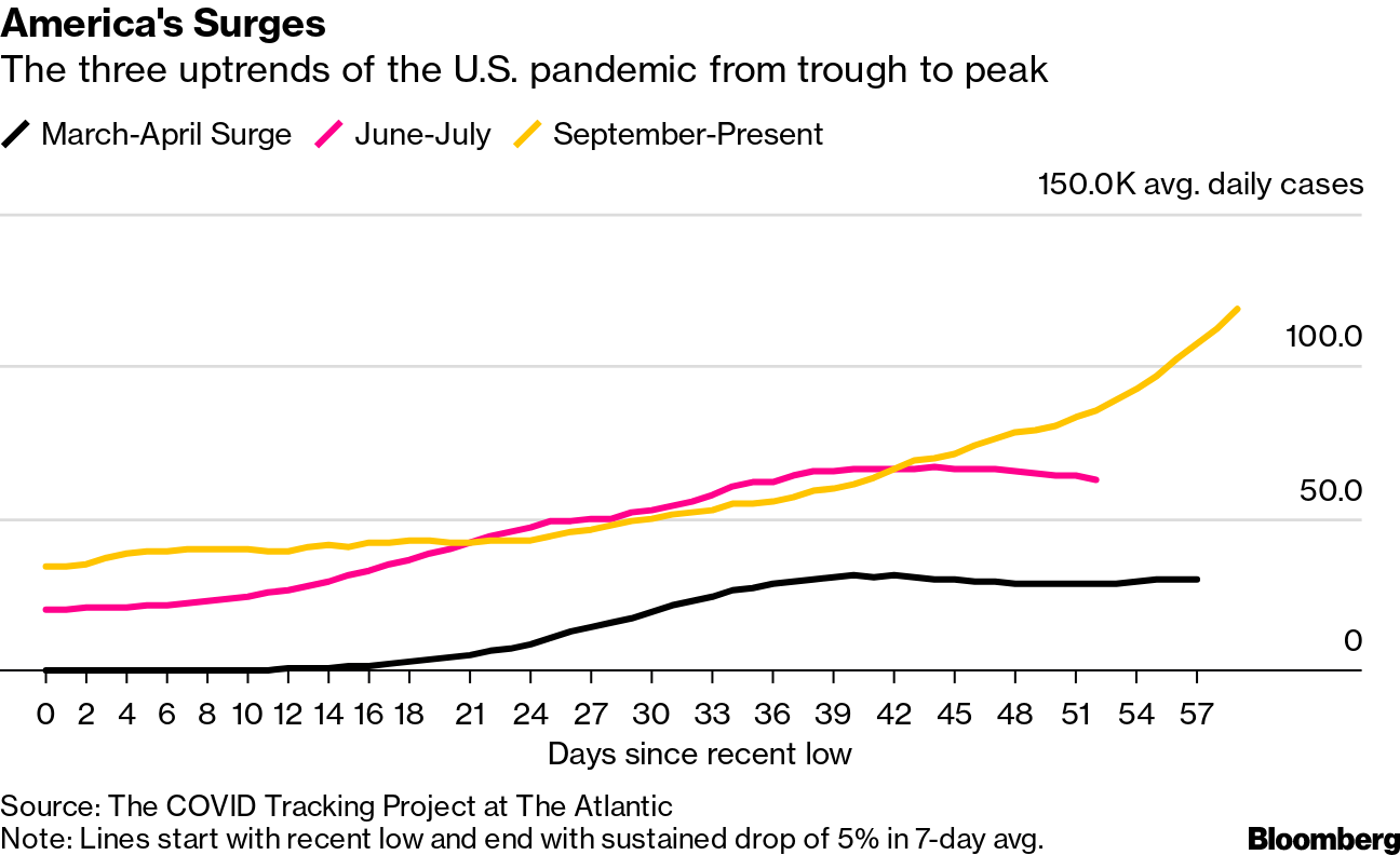 美国新冠肺炎感染病例的持续增加可能会变得更长。从9月开始的全国病例上升已经进入第九周。这比主要发生在东北部的三月至四月波动以及六月至七月席卷太阳带的波动时间更长。超过24万人死亡,而随着失控激增带来的住院人数增加,每天还会增加1300人。欧洲也正在经历一个致命的袭击,迹象表明疫情没有减缓的迹象。这里是疫情的最新情况。