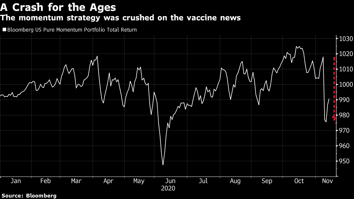 本周动量交易者有多倒霉?让我们这样说,不可思议地、不可能地、超出物理极限的倒霉。摩根大通表示,周一动量暴跌,是因为有关可能的新冠疫苗的消息,这是一个15西格玛事件。这种情况可能每1.090e+048年发生一次,这个数字有太多的零,据一些估计比宇宙中的粒子数量还要大。根据摩根大通的计算,这是有记录以来动量的最大变动,也是前十名中唯一由“好消息”引发的(其他的来自2008-9年的金融危机,或者今年早些时候的市场抛售)。