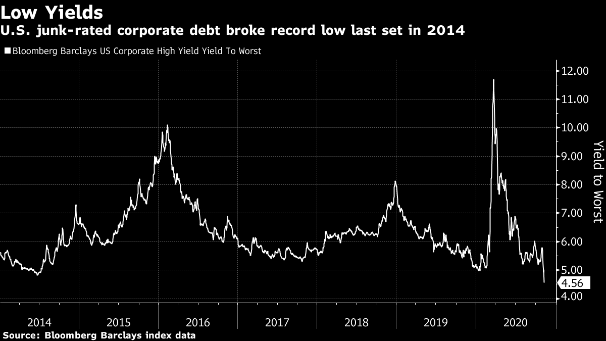 这周又有一个引人注目的头条:彭博巴克莱美国公司高收益指数的平均收益率周一暴跌至创纪录的4.56%,低于2014年6月创下的4.83%的历史最低水平。从上周五收盘价下跌了45个基点,是自4月9日以来最大的下降,当时美联储扩大了其公司债购买计划,包括某些垃圾债券。