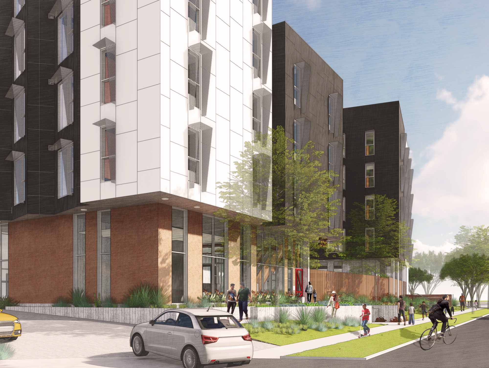 三哥法院公寓的渲染图,这是位于加利福尼亚州米尔皮塔斯的一个交通导向住房开发项目,该项目曾经可以从分配给Brightline West铁路项目的私人活动债券中受益。