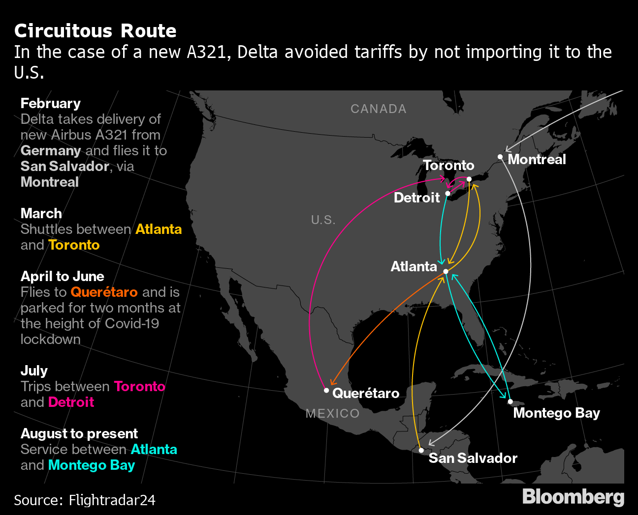 巧妙规避 | 达美航空正在通过最初将欧洲喷气客机路由到阿姆斯特丹和萨尔瓦多等地避开数百万美元的美国对欧洲飞机征收的关税。自特朗普的关税于2019年10月生效以来,这家美国航空公司已经接收了七架欧洲制造的空客飞机 — 但将它们驻扎在海外使这些飞机不被视为进口,尽管其中一些经常进入美国。
