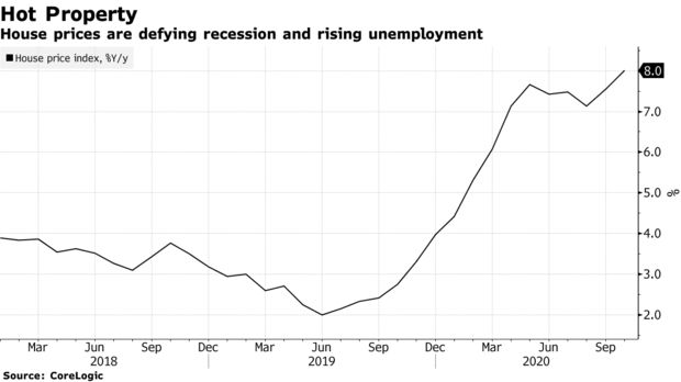 受到创纪录低利率的推动,十月份平均房价同比激增8%。这种情况也出现在其他国家——即使那些尚未控制住疫情的国家。英国的房价创下纪录,即使它正准备迎接新的限制措施。在美国,第三季度房价同比增长创下了七年来最大涨幅。与此同时,在澳大利亚,十月份房价六个月来首次上涨。