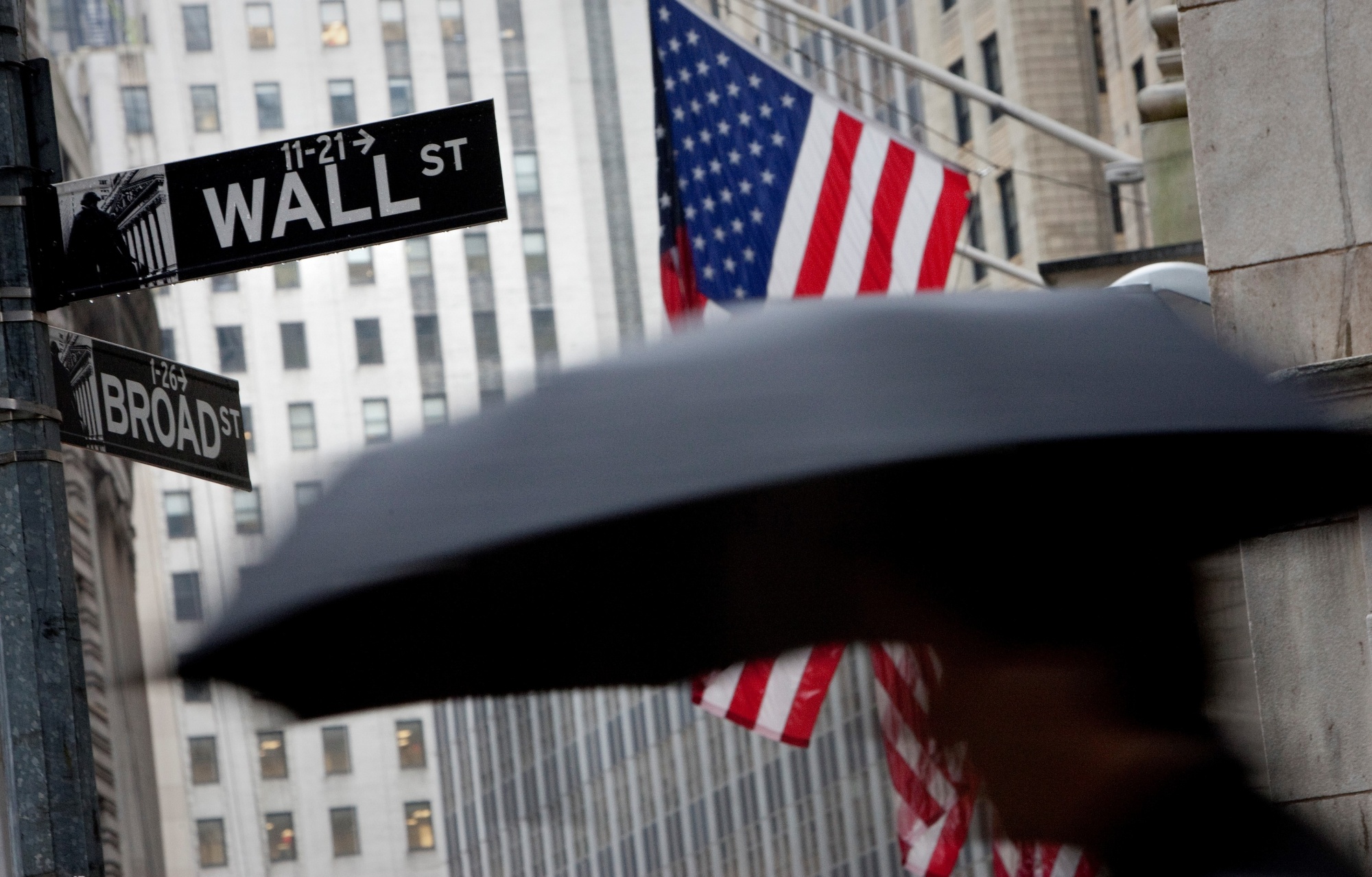 一名行人在华尔街撑着伞。
