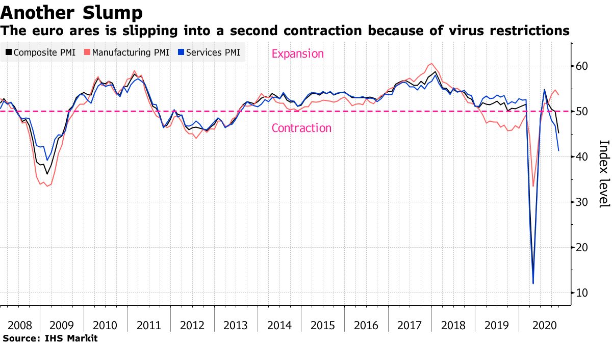 欧元区在新的病毒限制措施下再次陷入衰退,这对经济的某些部分造成了巨大损失。IHS Markit的综合采购经理人指数从10月的50下降到11月的45.1,暗示产出在下降。这个数据意味着什么。