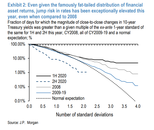 当涉及美国国债时,今年可能最终会成为一个两半的游戏。前六个月以疫情引发的市场大幅抛售为特征,美国政府债券出现了“不应该发生”的大幅波动,JPMorgan指出,美国国债出现大幅波动的天数比正常情况下预期的要多得多。与此同时,年底的另外六个月显示出完全相反的情况,美国国债市场的波动性被完全抑制,现在朝着另一个方向出现异常。由于美联储的前瞻指导,我们已经从 峰度转向了非峰度。