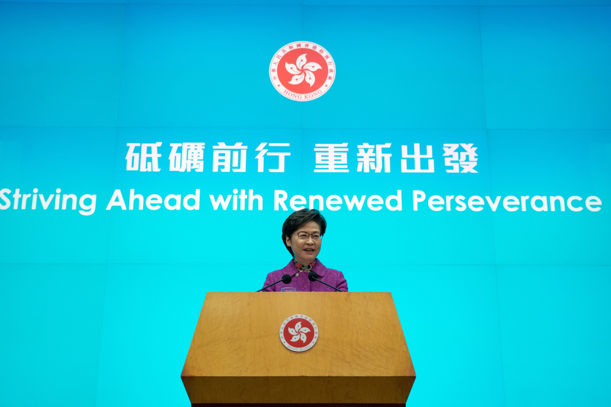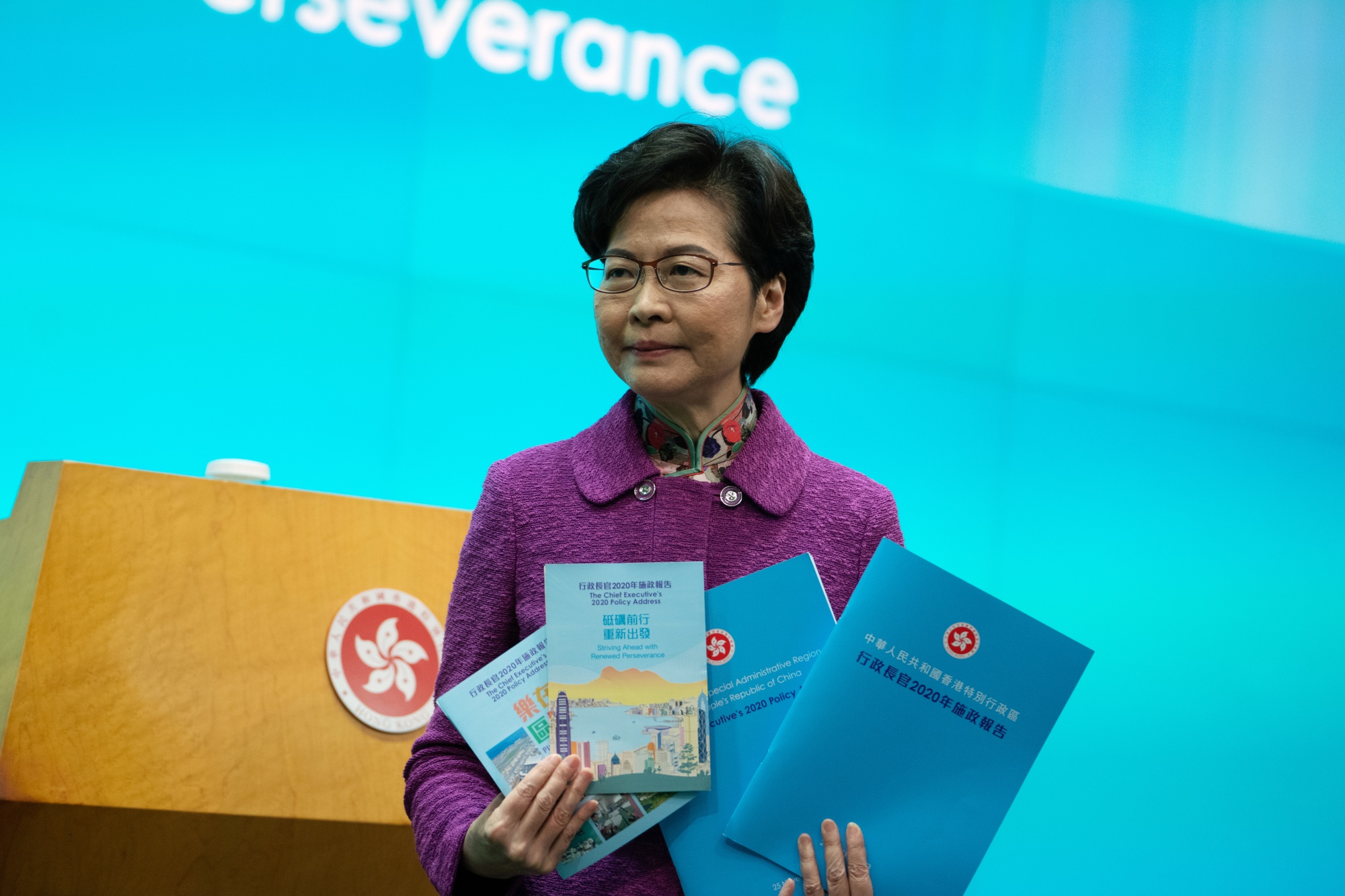 香港特首林郑月娥在周三的新闻发布会上与她的施政报告副本合影。