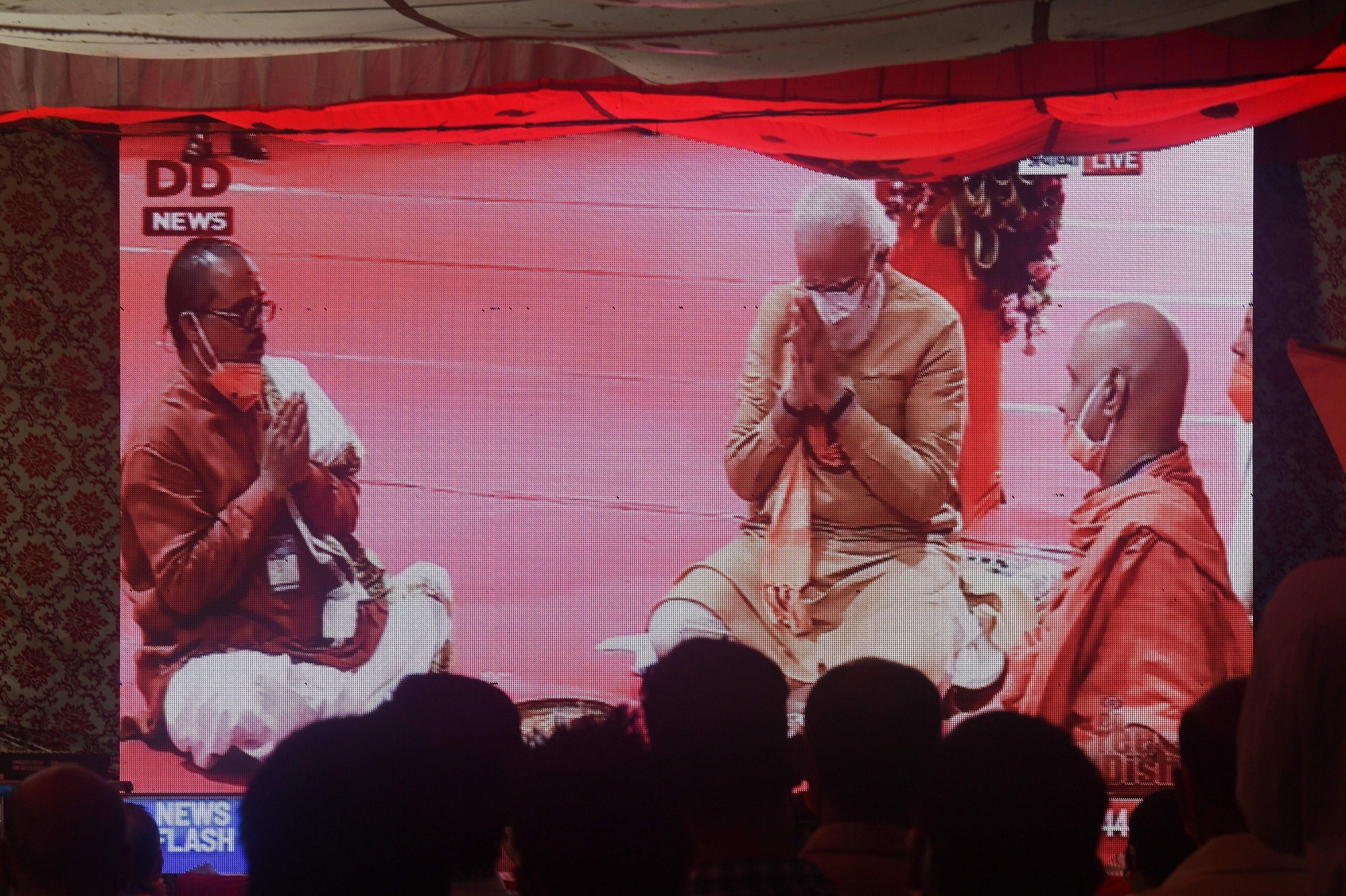 人们在阿约提亚从屏幕上直播观看莫迪参加新德里兰姆寺奠基仪式期间进行印度教宗教仪式。摄影师:普拉卡什·辛格/法新社通过盖蒂图片社