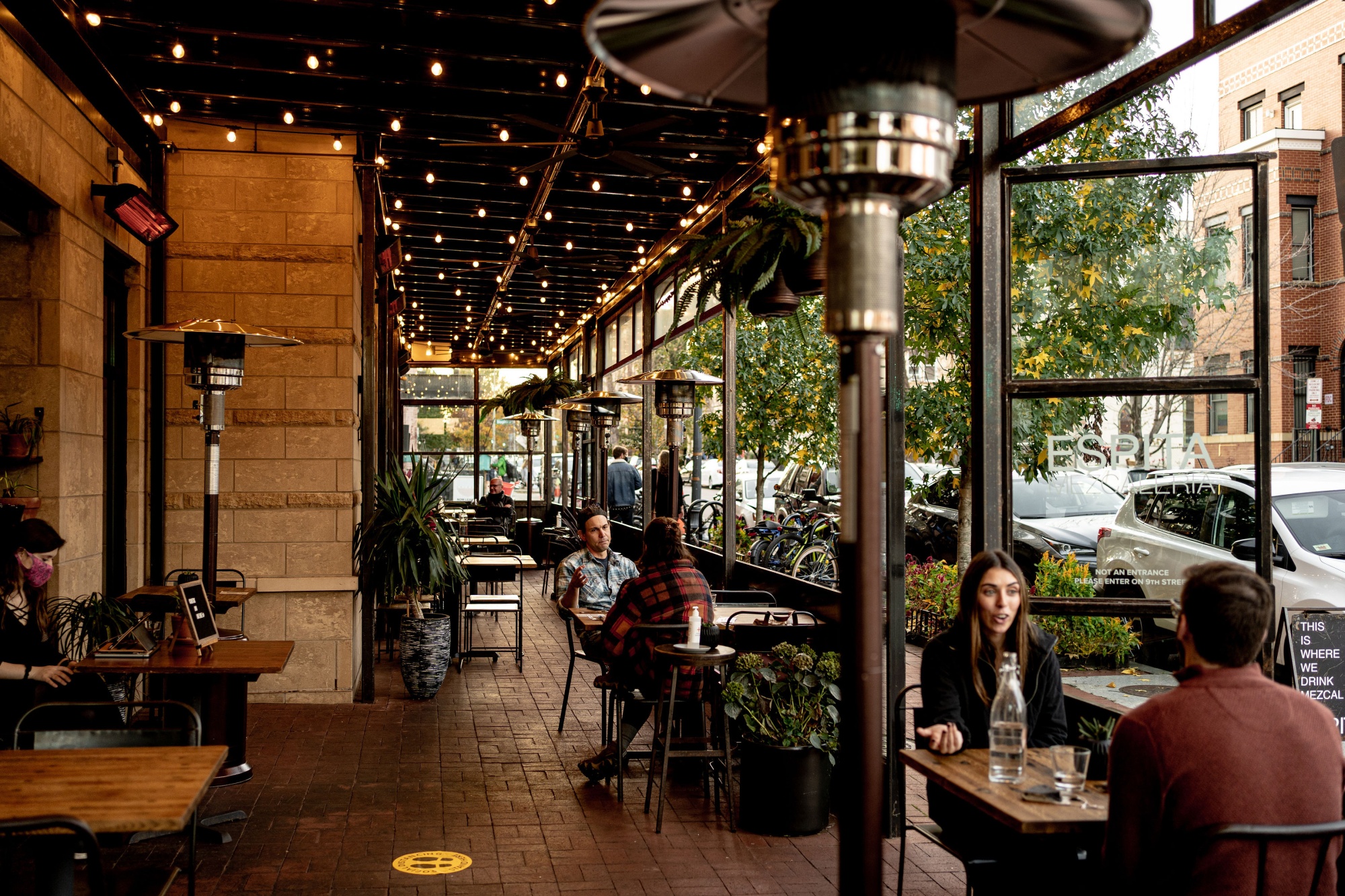 华盛顿特区Espita Mezcaleria户外庭院的用餐者照片由Leah Judson提供对于华盛顿特区的Espita Mezcaleria来说,为其宽敞的庭院做防风保暖意味着增加热灯和塑料板,但也包括植物和其他装饰元素,使室外区域像室内一样具有吸引力。事实上,它看起来就像是餐厅旁边的一个独立咖啡馆。Espita的总经理兼合伙人乔什·菲利普斯(Josh Phillips)表示,沿着Espita庭院的塑料窗户板封闭了不到40%的周长,大部分区域仍然是开放的。为了增加安全性和舒适度,大多数桌子之间的间距至少有9英尺。