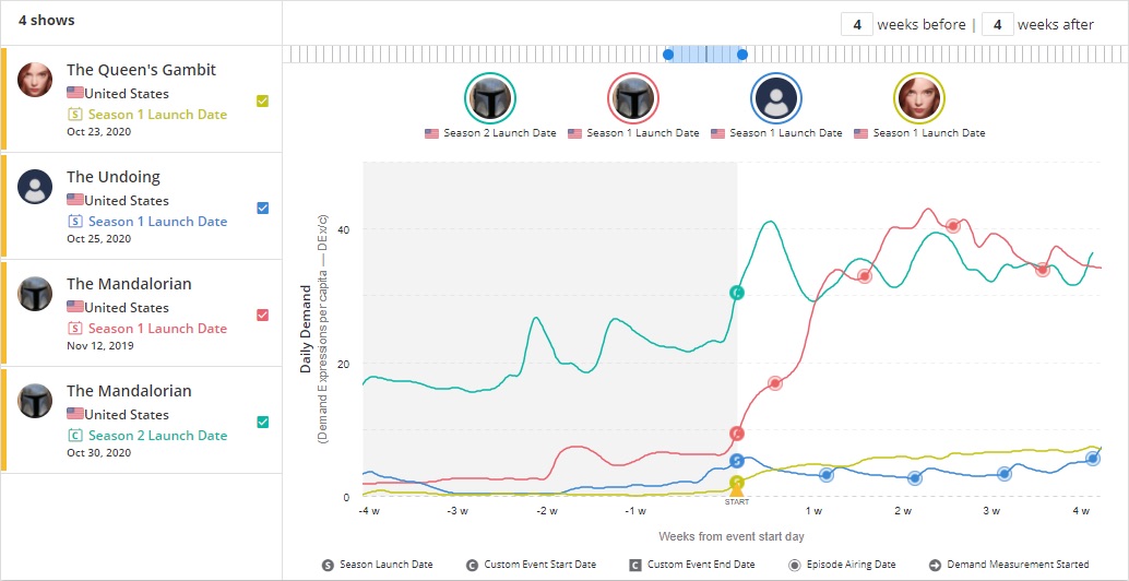 但即使没有可比较的数据,每个节目都体现了 Netflix 和 Disney 之间为好莱坞灵魂而展开的较量。Netflix 一次性发布了所有集数,将注意力最大化了一个月左右,而 Disney 则每周推出一集,给顾客一个每周回来的理由。