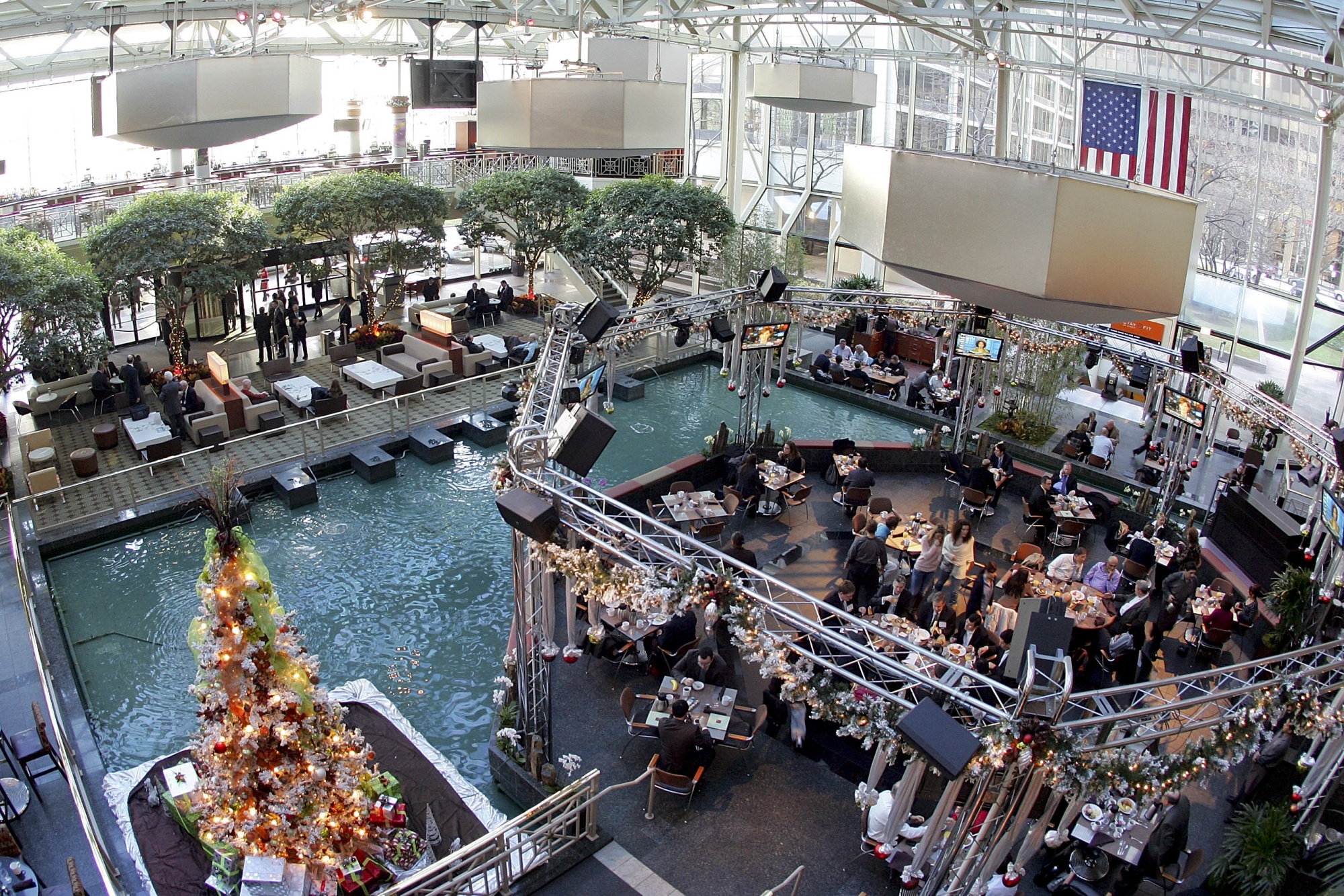 唐纳德·特朗普在1980年将纽约康姆多尔酒店重新包装并改建成镜面大都会凯悦酒店时,要求建造一个中庭。然而,由于特朗普在翻新中未动建筑的1919年骨架,这事实上是不可能的。