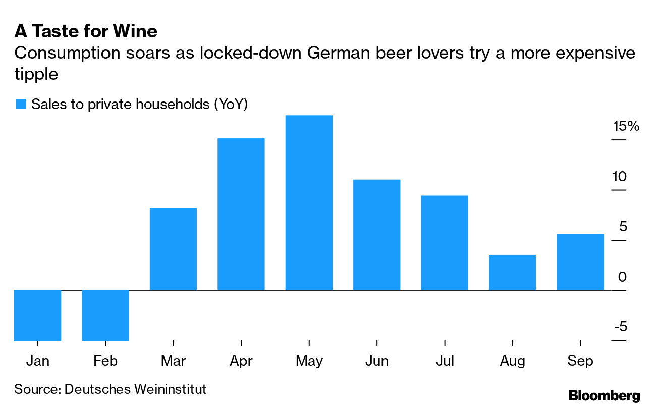 欧洲最大的啤酒消费国正在尝试葡萄酒。根据德国葡萄酒研究所的数据,自从三月份引入公共社交限制以来,德国私人家庭的葡萄酒销量每个月都在增加。尽管该国的1500家啤酒厂面临有史以来最艰难的一年,但德国葡萄酒生产商现在提供在线品酒活动,这已经成为一大热门,行业协会表示。