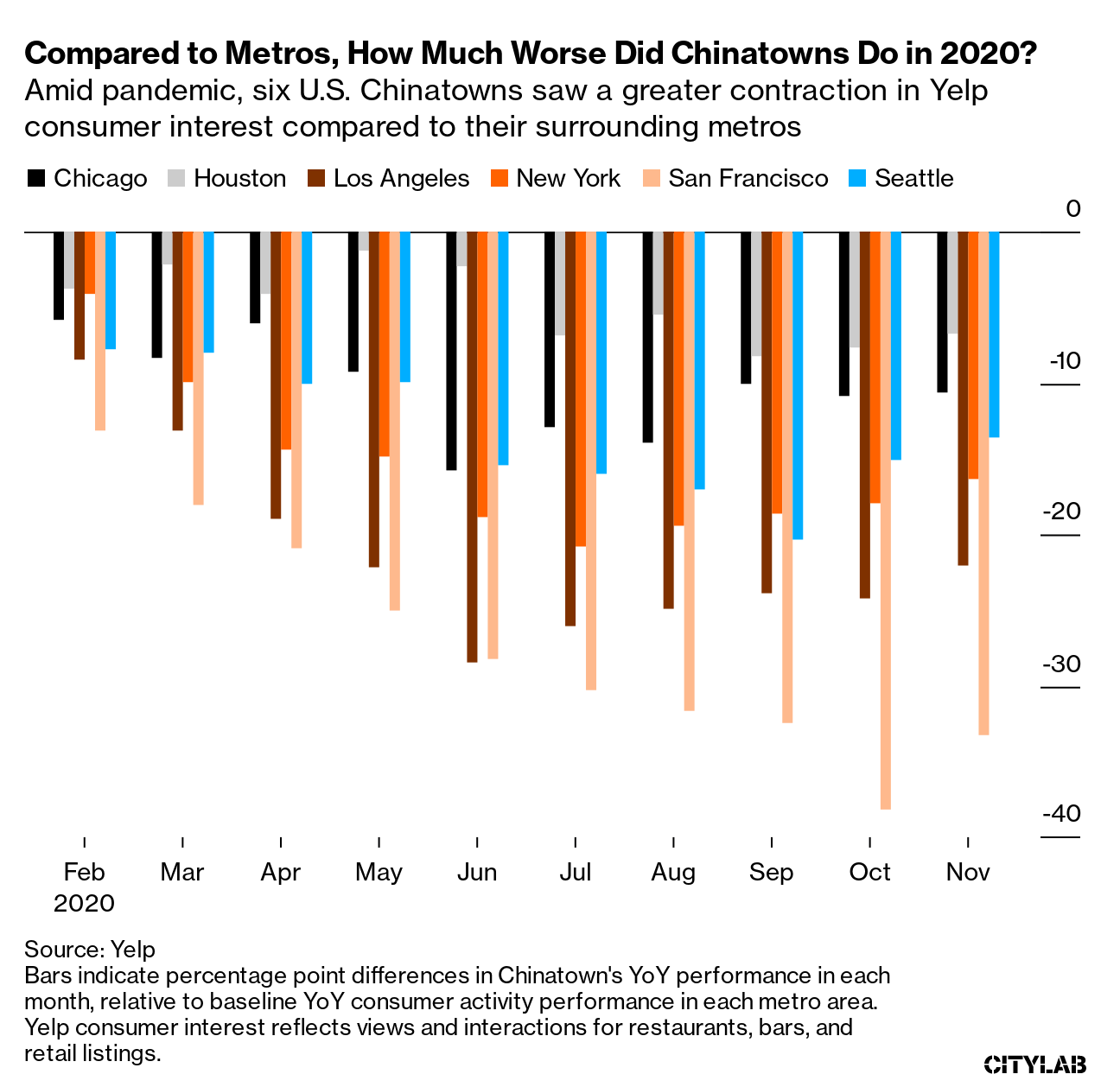 从2月到11月,与这六个唐人街相关的邮政编码区域的餐馆、酒吧和零售商的消费者兴趣水平落后于它们所在大都会地区。即使在公共卫生限制损害了城市经济的整体情况下,即使部分复苏开始后,这一情况仍然如此。下面的图表显示了,根据唐人街和大都会地区消费者兴趣的年度增长率之间的百分点差异来衡量。