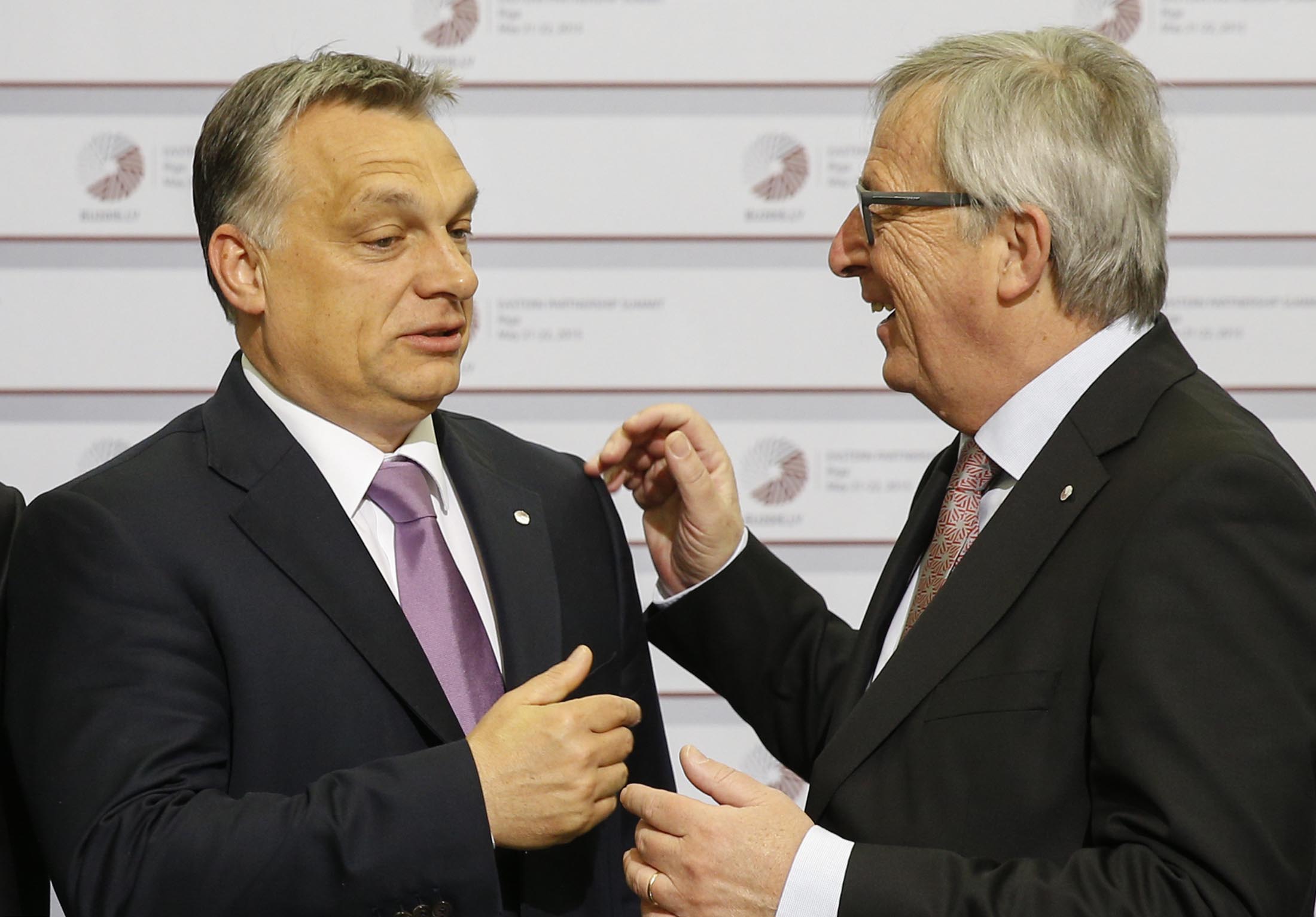 让-克洛德·容克(Jean-Claude Juncker)右边,维克托·奥尔班(Viktor Orban)在2015年里加拉脱维亚东方伙伴关系峰会上发表讲话。