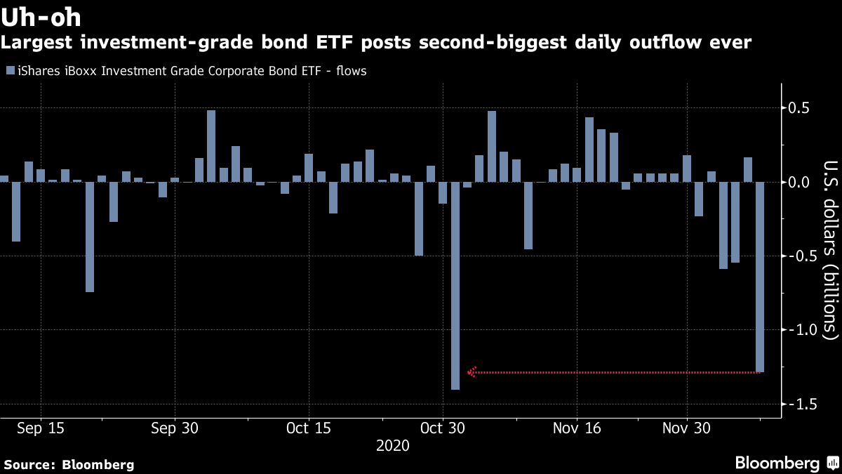此外,这种情况可能不会持续太久。作为一个沉重的结束语,这是最大的美国公司债券交易所交易基金本周遭受的接近纪录的每日资金流出: