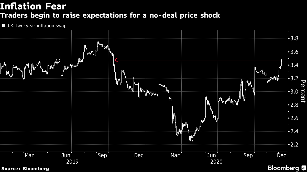 交易员们不会为谦卑的馅饼而逗留。他们押注进口成本激增,加剧了英镑进一步下跌——它已经对美元贬值了约1%——推高了消费者价格。两年期通胀掉期已经达到一年多以前的水平。