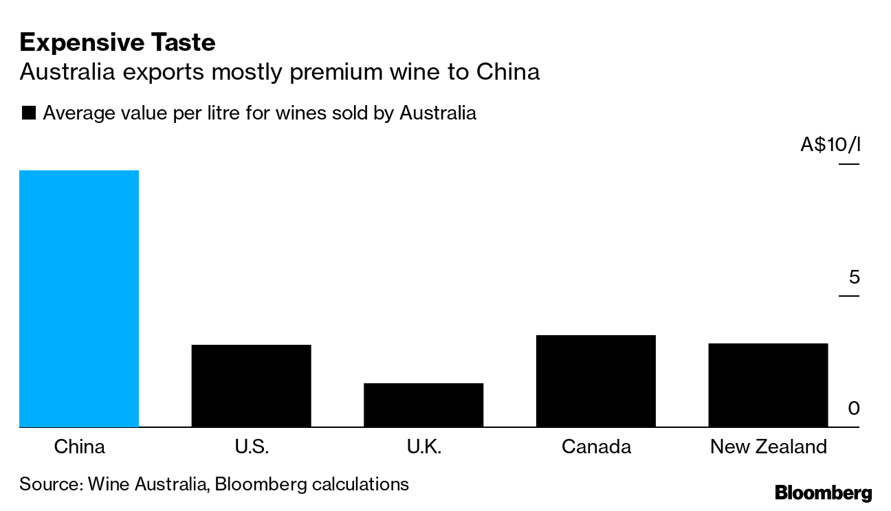 最新一轮的中国关税——可能将进口关税总额提高到215%以上——让澳大利亚的葡萄酒生产商感到震惊。在过去的25年里,随着中国中产阶级的增长和对酷爽地区西拉、赤霞珠和其他大红葡萄酒的需求,中国已成为澳大利亚最大、最热情的客户。澳大利亚在2019年超过法国成为该国价值最高的出口国;去年,中国在进口上花费了12亿澳元(9.04亿美元),约占澳大利亚总出口的40%,根据澳大利亚葡萄酒协会的数据。
