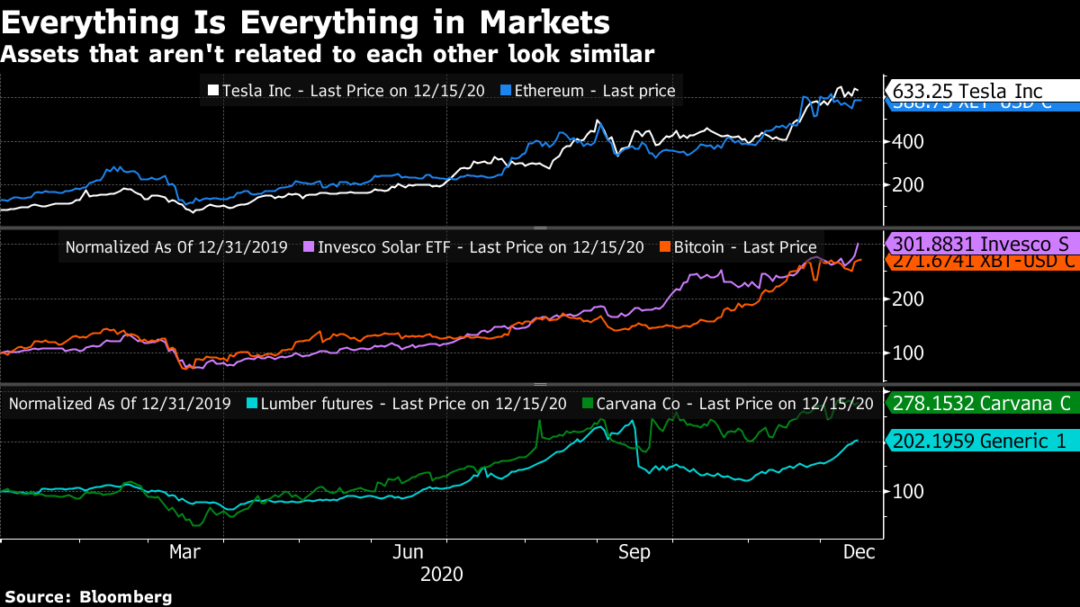 “一切就是一切,”劳伦·希尔22年前唱道。这是2020年市场的主题曲。奇怪的相关性无处不在,一切看起来都像其他一切。我最喜欢的例子必须是特斯拉和以太坊,但你可以在各个地方找到类似的图表。木材期货和太阳能股票是另一对奇怪的组合,Carvana和比特币是另一对,等等。