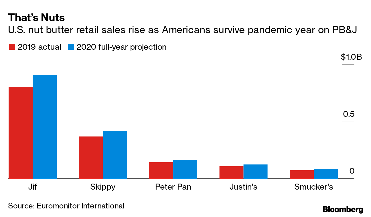 今年,美国人备货最简单的舒适食品:花生酱(和果冻)。坚果和种子酱——比如杏仁酱和葵花籽酱——在更多居家用餐的情况下受益匪浅,根据欧睿国际(Euromonitor International)的数据,美国零售市场预计在2020年增长14%,达到近27亿美元。