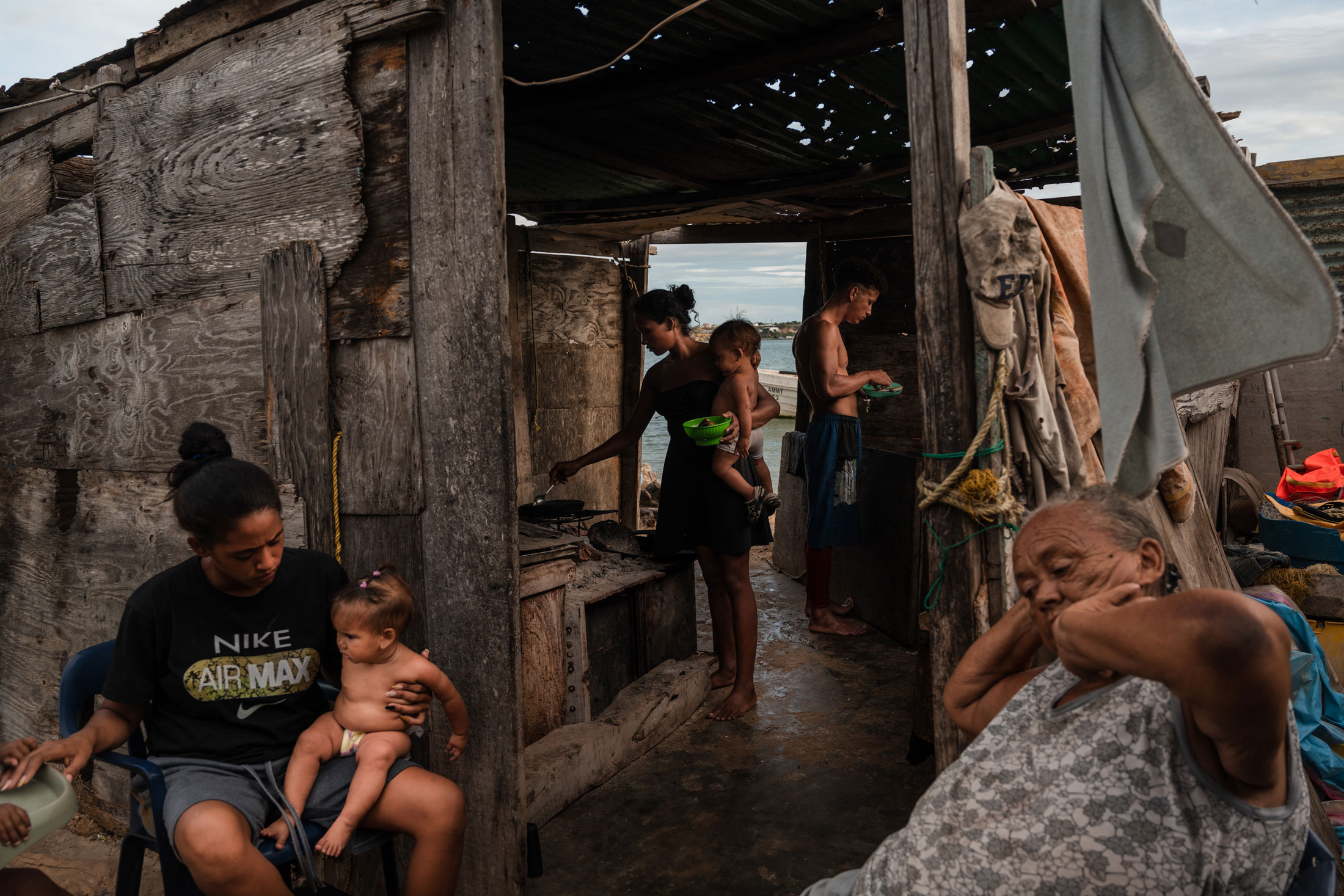 蕾娜·法尔孔的家人,右下角,在11月16日在拉斯皮德拉斯用木柴火做饭。摄影师:Adriana Loureiro Fernandez(彭博绿色)法尔孔从阿姆阿伊炼油厂镇的海滩上近距离目睹了PDVSA的衰落。由于住得离综合体如此之近,她担心家人的健康和安全:2012年发生的一次巨大爆炸造成至少42人死亡,自那以后,火灾和爆炸几乎成了家常便饭。