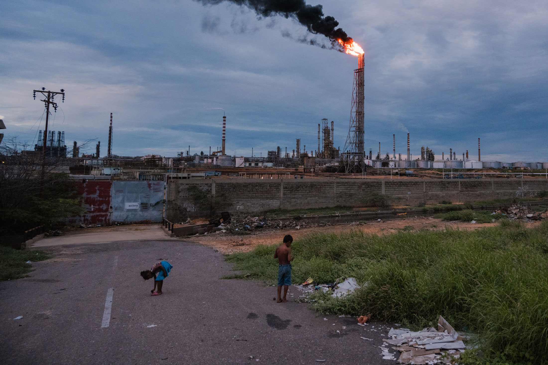 11月16日,儿童在法尔孔州帕拉瓜纳炼油厂附近的道路上玩耍。摄影师:阿德里亚娜·洛雷罗·费尔南德斯,为彭博环保拍摄“我们已经做好准备,我们接受过培训,委内瑞拉不会因为油价降至10美元,甚至更低而停滞不前,”他在四月份说。