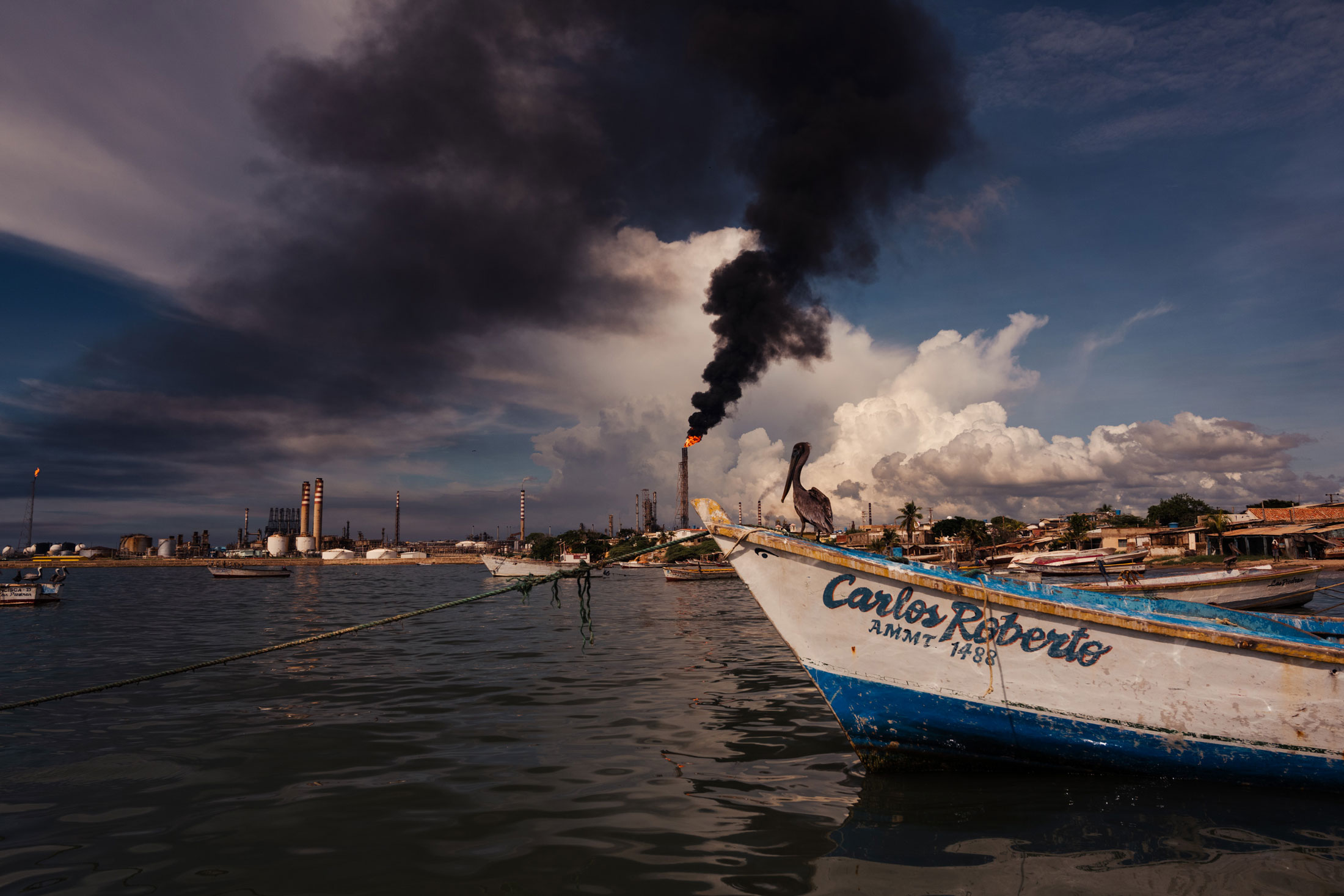 40岁的乔万尼·梅迪纳来自海湾对面的卡东,那里是一个渔村,已经成功地与壳牌于1949年建造的炼油厂共存。他并不担心里奥塞科被迫离开的渔民的竞争。他最担心的是无休止的污染,这意味着他必须使用更多汽油将他的木制小船,也就是所谓的佩涅罗,驶入更深的水域。