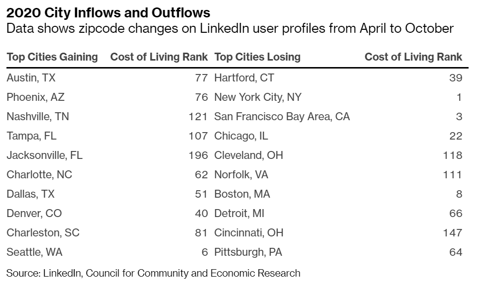 新冠疫情正在加速美国人从更昂贵的州搬到更实惠的州,而且不仅仅是拉里·埃里森在搬家。领英提供的数据显示,根据他们的个人资料在今年4月至10月之间的邮政编码变化,哪些城市吸引了人口,哪些失去了人口。