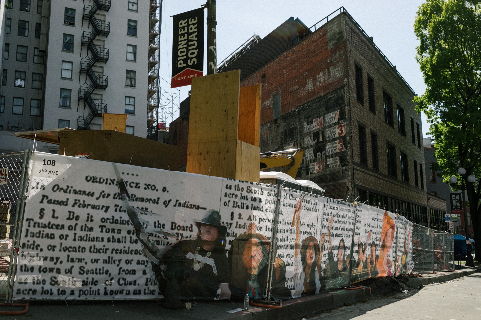 围绕着一个旨在为美洲原住民提供住房的新西雅图住房项目的围栏上装饰着1865年城市法令中驱逐土著人口的图像。