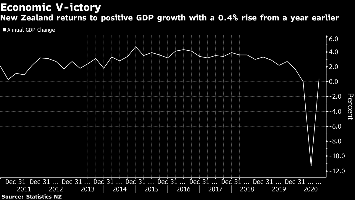 瞧,一个罕见的V型复苏!这要归功于新西兰,该国在控制冠状病毒方面做得比大多数国家都要好,现在正在享受其遏制努力带来的经济成果。新西兰的国内生产总值在第三季度跃升了14%,超过了12.9%的中位数估计,创下了有史以来最大的季度增长。卖方分析师的报告中充满了关于V型复苏的讨论。汇丰银行表示,“这才是你所说的‘V’”。国民生产总值的增长足以“超过2020年第二季度季度环比下降11%的幅度,并确认了V型复苏”,高盛表示。花旗表示,新西兰“已经恢复到新冠疫情前的产出水平”,数据证实了“明显的V型复苏”。