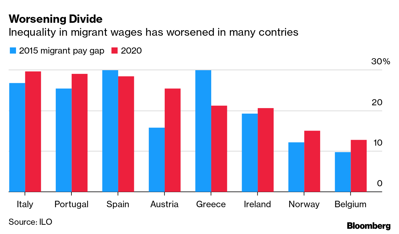 根据国际劳工组织的数据,世界上最富有的经济体中的移民工人的收入比本国工人低12.6%,而这一差距正在扩大。