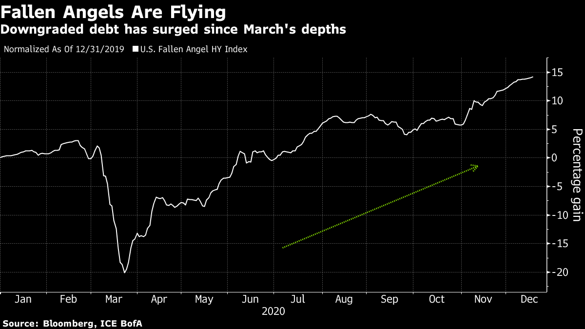 这些问题受到了强烈的需求,而且理由充分。自从三月份的低点以来,跟踪美国堕落天使的指数——即被评为投资级的债务被降级为垃圾级的债务——已经激增了大约43%。与此同时,创纪录的现金涌入了跟踪这类证券的交易所交易基金。