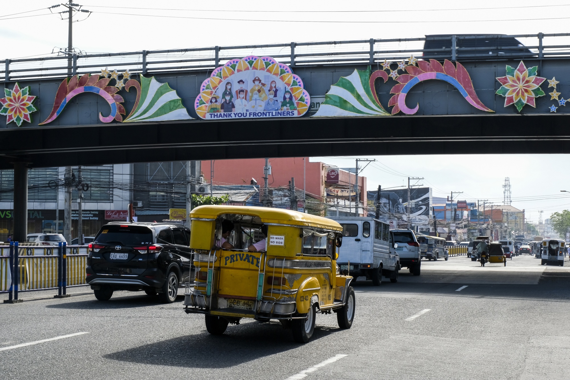 一辆吉普尼(jeepney)在棉兰老下的一座桥下行驶,桥上有一幅感谢前线工作者的壁画。