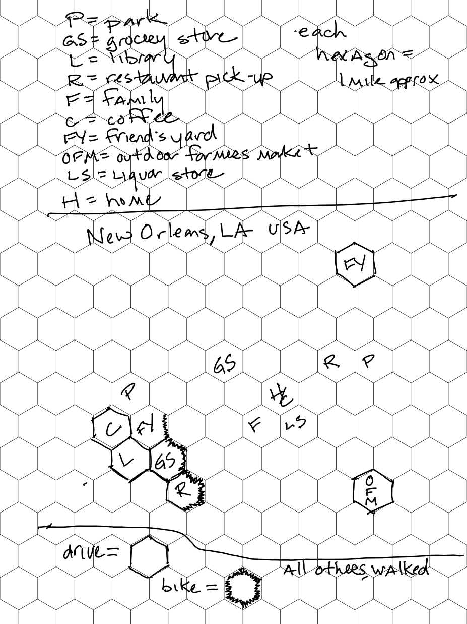 新奥尔良人是公共空间的重要使用者,2020年对我们所有人来说在这方面发生了很大变化。我们的市长对这场大流行非常严厉,因此我的地区(法国区)几乎在三月份完全关闭。我绘制了我今年使用过的地方;每个六边形基本上是周围一英里。只有在符合适当社交距离规则的地方才会使用每个位置:口罩、六英尺的距离,尽可能在室外。所有使用的商店/市场都遵循适当的距离、彻底的清洁程序和员工保护。这张地图通常会有我参加的数十个活动,以及我与朋友见面的数十家餐厅。不幸的是,在最近几个月,游客活动有所增加,而这些游客中戴口罩的比例远低于居民。