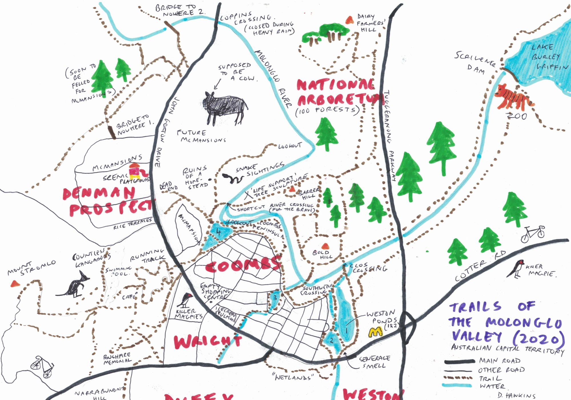 新冠疫情在我第一次成为父亲的同时也袭击了澳大利亚。我和我的家人从海外搬回家乡,搬到了堪培拉郊区,那里的新开发项目与自然保护区交织在一起。我开始寻找家附近的步行和骑行道,同时不会走得太远,因为政府和父亲身份施加了移动限制。我发现了标记为开发区的地方,通往无处的桥梁以及一些具有攻击性的野生动物。有了一个新生儿,我们一直会在家附近度过这一年。新冠疫情进一步缩小了我们生活的范围,但这成为了一个探索和享受这片空间的绝佳机会,带着我的女儿在树林间散步,欣赏我们的周围环境。这个地区正在快速变化,新的开发项目得到批准,许多道路和小径尚未完工或临时性的。这张步行和骑行道地图代表了一个时间点:一两年后,这个山谷将会看起来截然不同。