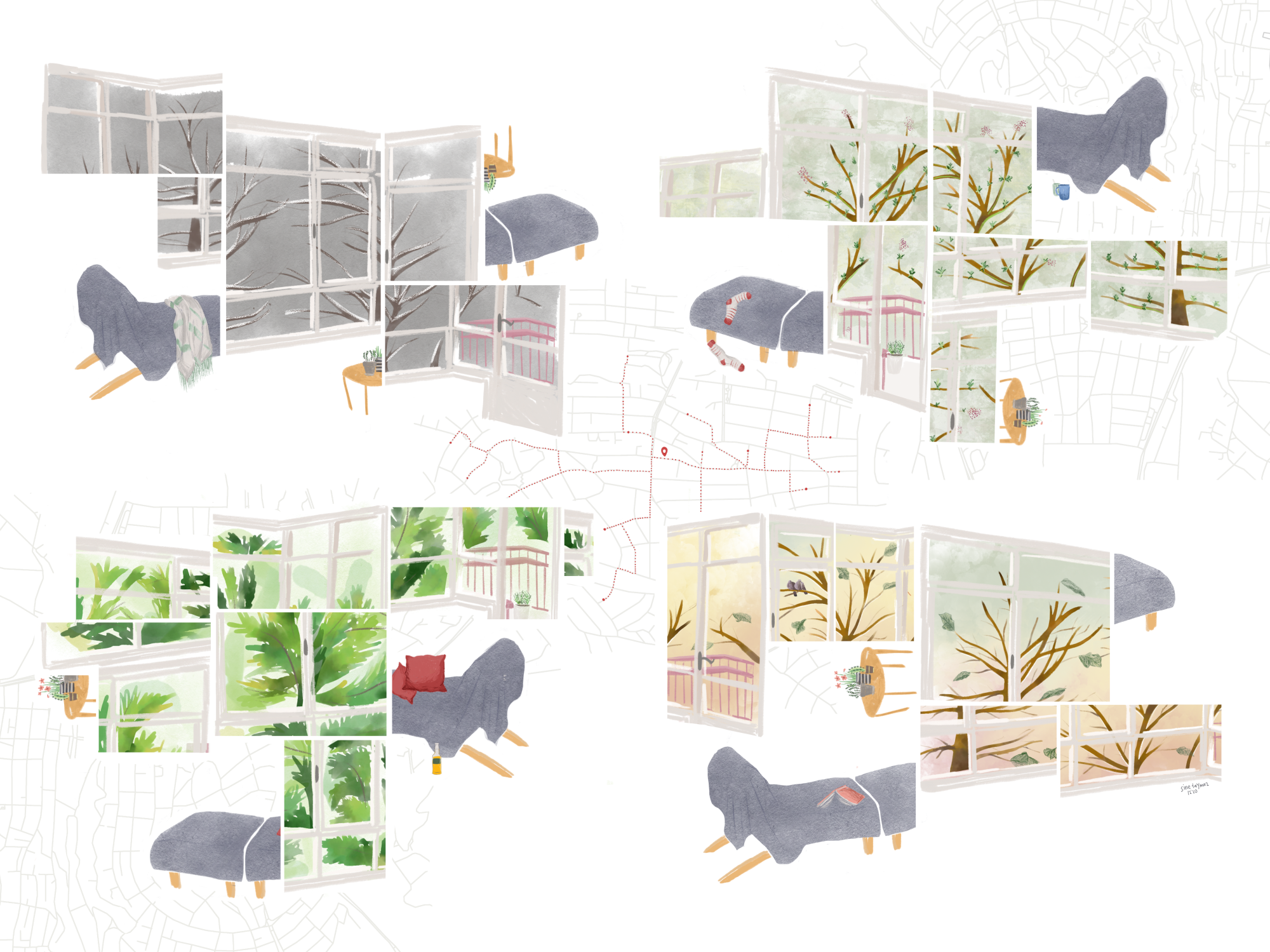 2020年,我的世界几乎变得和我的客厅一样小。在同一个空间里工作、吃饭、喝水、社交和休闲,我从窗户和阳台上看着四季更迭。从左到右,从下到上,我在这些画框中看到了大自然的变化。在家外,我最终有了一个相当固定的步行路线,其中包括购买必需品和不时与亲人见面。这也在我的地图上标记了路线。我会记得错过的机会和无助的感觉,因为不能在亲人需要和想要时在他们身边。
