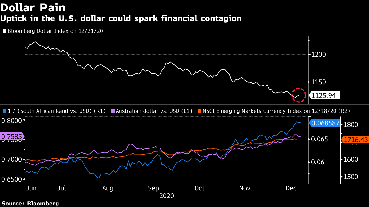 投资者正在寻求美元,因为它具有避险地位。但正如Medley Global Advisors的Ben Emons指出的那样,随着货币市场上对疫苗的押注被解除,绿色美元也在获得提振。他说:“市场面临的最大风险是美元突然大幅上涨,因为投资者从那些在疫苗背景下更快复苏的货币中撤出。”所有这些都发生在一个敏感的时刻,因为年底通常是流动性更为紧张、资产负债表更为有限的时候。换句话说,2020年有可能以病毒传播演变为不可预测的金融传染的方式结束,就像它开始的方式一样。