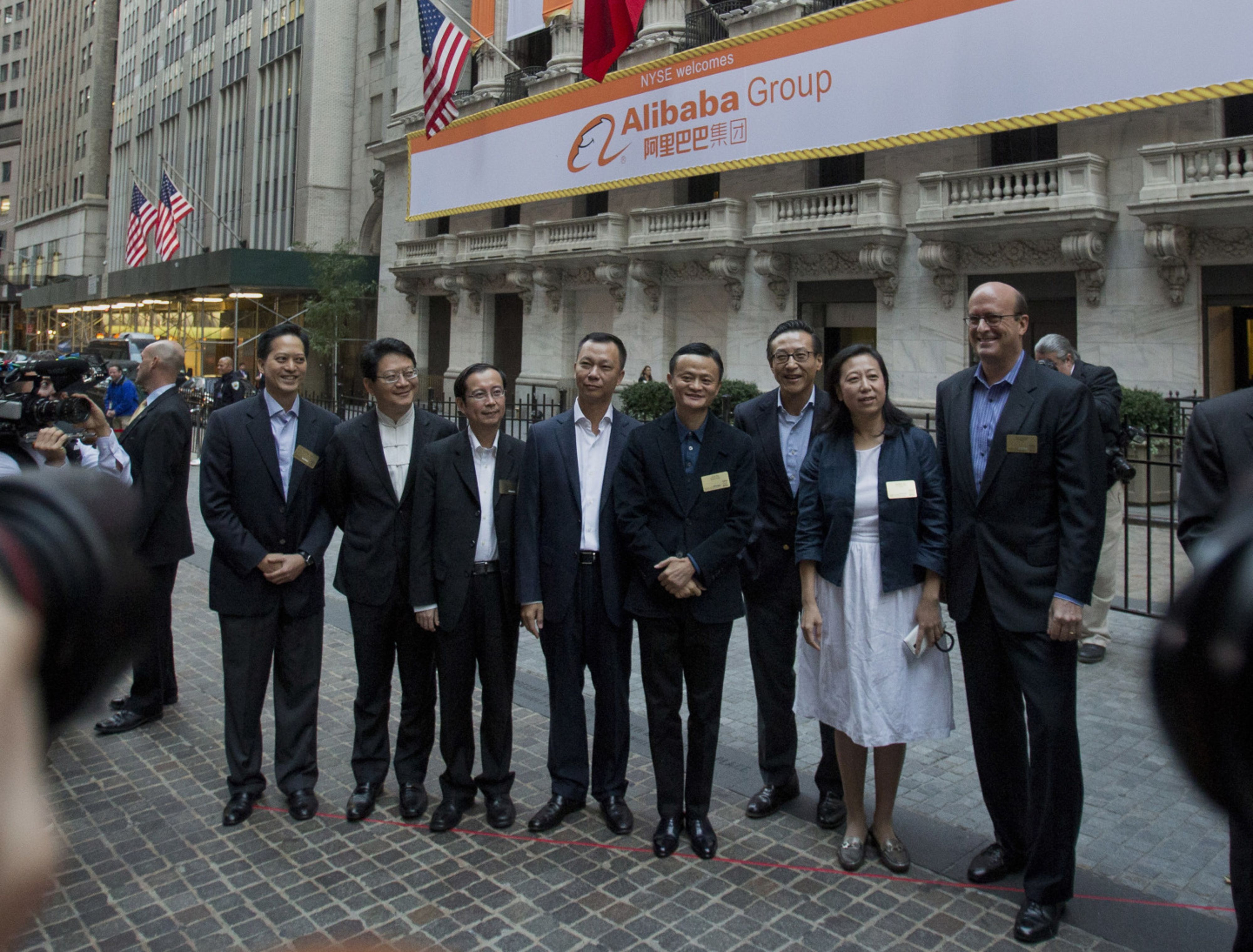 马云(右四)与其他阿里巴巴高管站在纽约证券交易所前,庆祝公司于2014年9月19日在纽交所上市。摄影师:Scott Eells/Bloomberg工商监管机构最终让步,随后在当月发布了一封信函,表示某些官员的观点并不代表管理总局,从而结束了冲突。该机构表示,批评公司的报告没有“司法效力”。