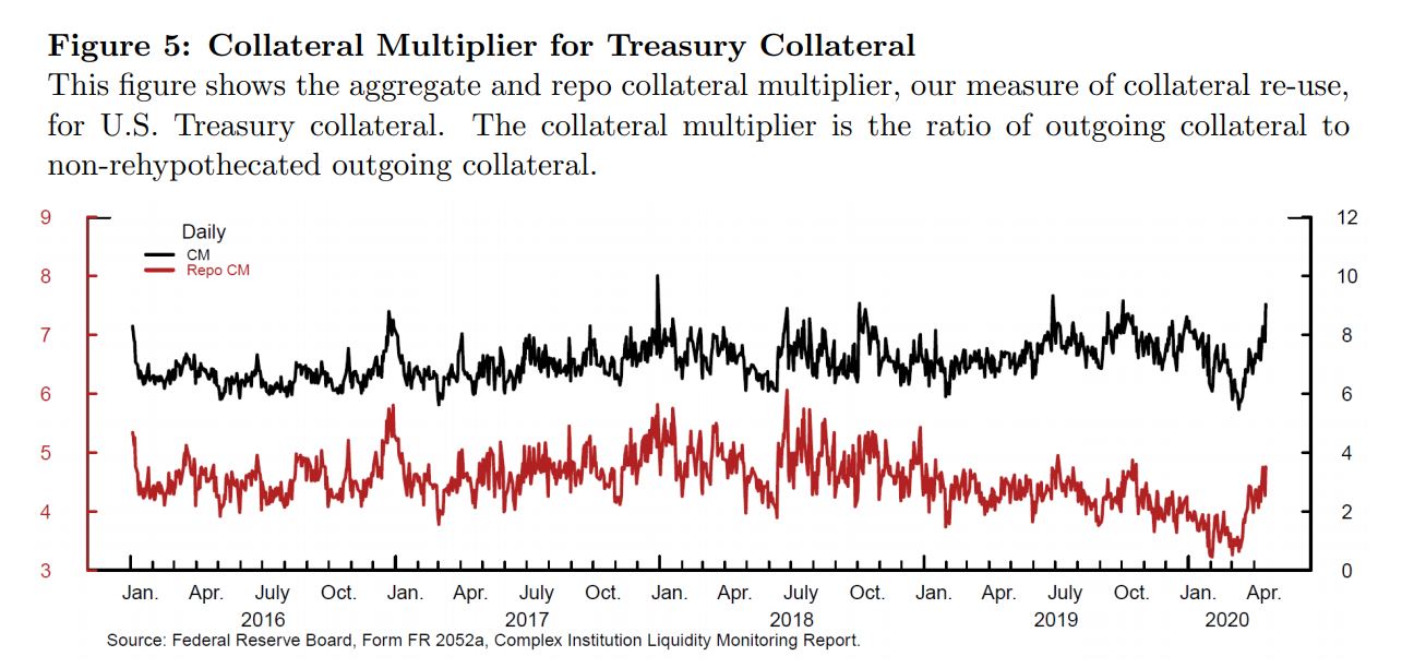 这种动态在今年市场暴跌的最严重时期得到充分展示。回到三月份,随着交易商银行在提供担保融资方面收缩,抵押品链明显缩短,而其他投资者则在抛售美国国债。根据美联储的文件,这导致美国政府债券再利用率创下历史新低。一旦美国央行介入市场平息局势,抵押品链再次开始延长,有助于增加金融系统中可获得的融资。