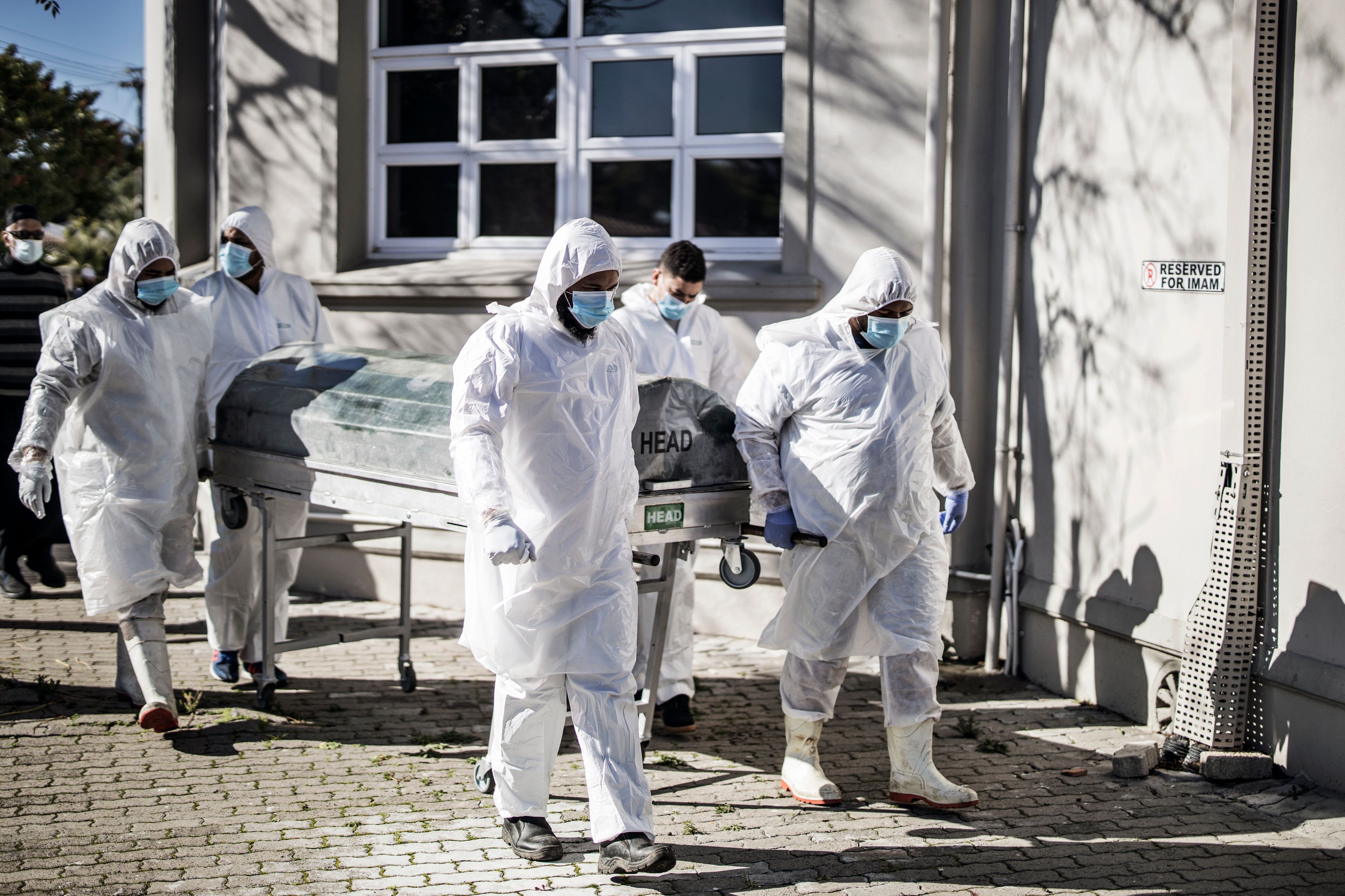 殡仪馆工作人员在开普敦一座清真寺为一名新冠肺炎受害者举行葬礼时抬着棺材。摄影师:MARCO LONGARI/AFP私立医院表示他们在一些地区面临床位不足的风险,正在重新部署员工并招聘新员工。政府已经关闭海滩,并在疫情热点地区重新实施了限制酒精销售的措施,给在度假旺季时期的旅游业造成了进一步打击。