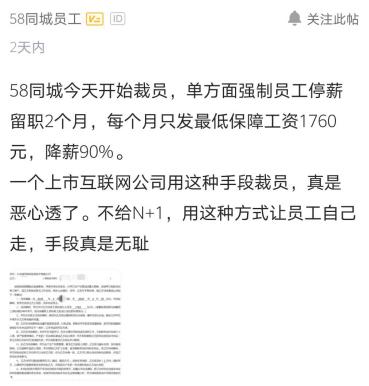 该爆料人士表示:“58同城即将裁员20%,且单方面强制员工停薪留职2个月。每月仅发最低保障工资1760元。”