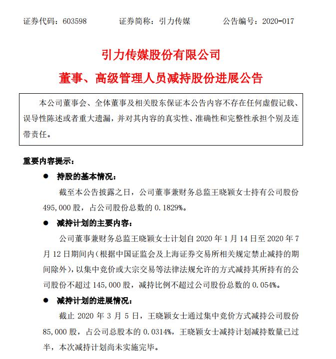 3月6日,引力传媒(603598.SH)发布减持股份进展公告称,截至2020年3月5日,董事兼财务总监王晓颖以集中竞价方式减持8.5万股,占引力传媒总股本的0.0314%。