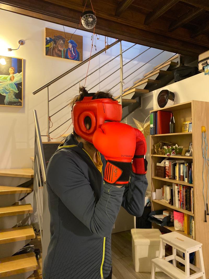 只吃不动,长胖怎么办?我和先生一直认为,宅家也要坚持运动,保持体型,增强抵抗力。我在西西里时,误打误撞地学习了泰拳,至今坚持了三四年。先生提出,我可以趁此机会教他泰拳。说来也巧,年初我们就买好了拳击手套和护具,但一直没有开始练。这下终于有了时间,我们的家庭泰拳课也就开张了。