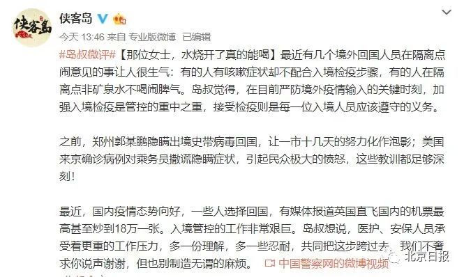 岛叔觉得,在目前严防境外疫情输入的关键时刻,加强入境检疫是管控的重中之重,**接受检疫则是每一位入境人员应该遵守的义务。**之前,郑州郭某鹏隐瞒出境史带病毒回国,让一市十几天的努力化作泡影;美国来京确诊病例对乘务员撒谎隐瞒症状,引起民众极大的愤怒,这些教训都足够深刻!最近,国内疫情态势向好,一些人选择回国,有媒体报道英国直飞国内的机票最高甚至炒到18万一张。入境管控的工作非常艰巨。