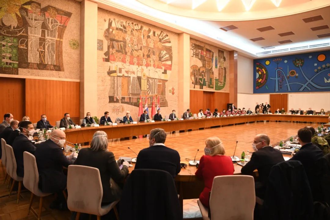 3月23日,在塞尔维亚首都贝尔格莱德,中国援塞医疗专家组成员与塞尔维亚国家抗疫指挥部举行交流会。新华社发(塞尔维亚总统府供图)
