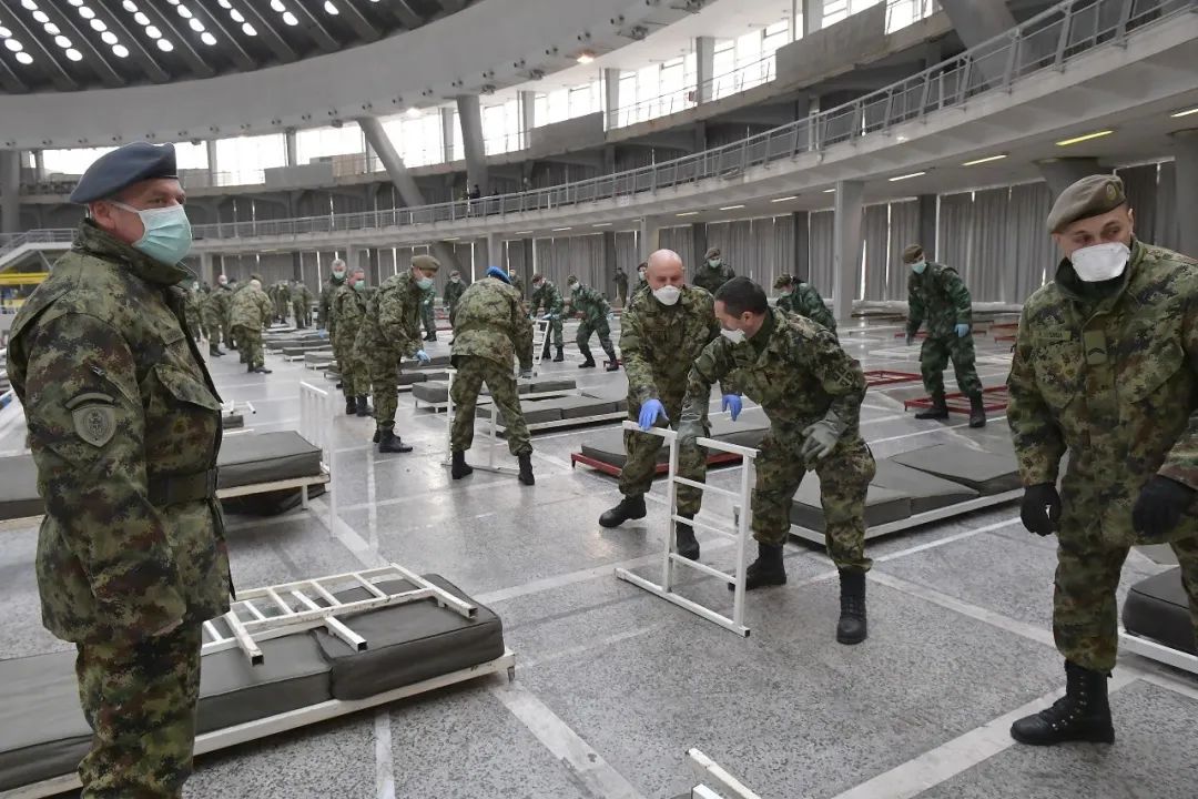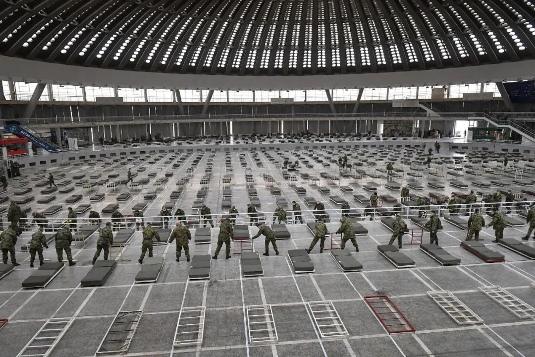 3月24日,在塞尔维亚首都贝尔格莱德,塞尔维亚士兵和工作人员为方舱医院组装病****床。新华社发(塞尔维亚国防部提供)