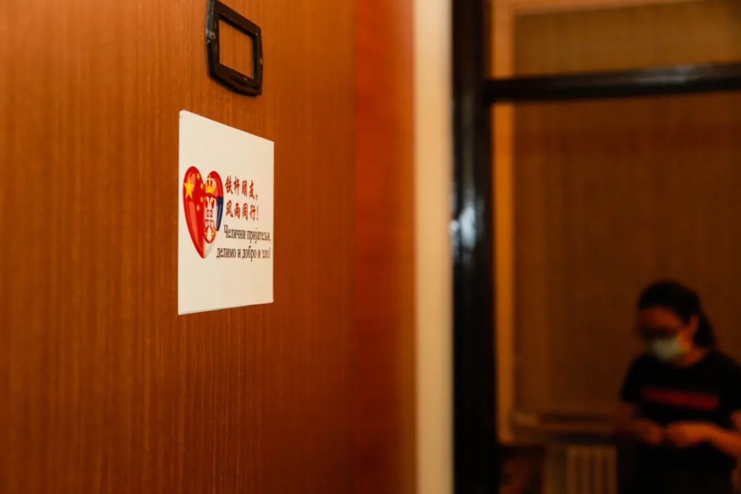 3月24日,在塞尔维亚首都贝尔格莱德,中国援塞医疗专家宿舍的门上贴着写有“铁杆朋友,风雨同行”字样的贴纸。新华社记者石中玉摄