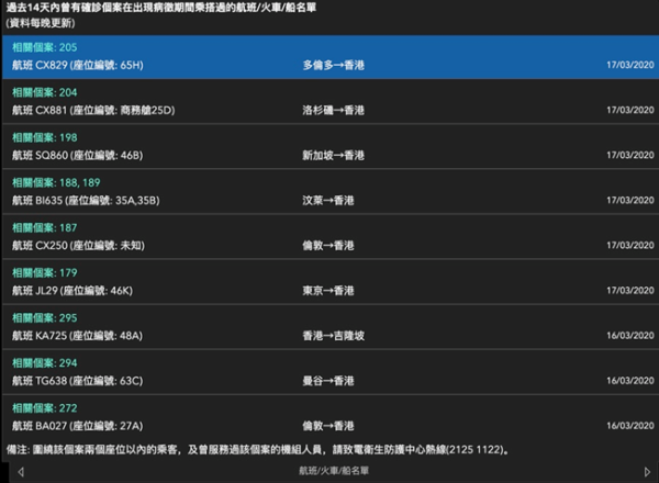 这个图表中标示的是16、17日有哪些确诊人士搭乘了航班赴港、离港(截图显示的不是全部信息)