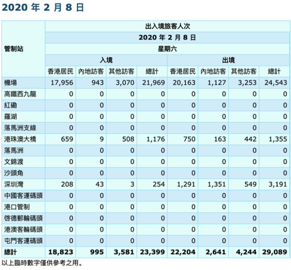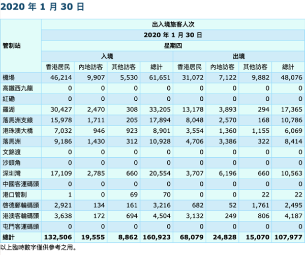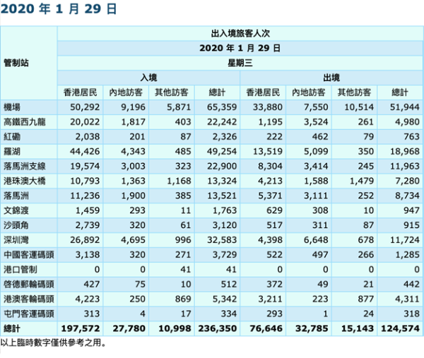 同一天,港府宣布,1月30日起会全面限缩与内地的交通往来,具体举措是:高铁西九龙站、红磡站、沙头角及文锦渡口岸客运暂停,而内地赴港航班将会减半、客运码头的跨境渡轮暂停,并减少部分跨境巴士班次。